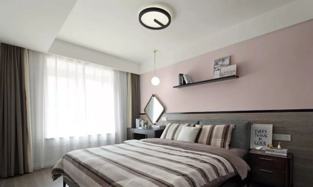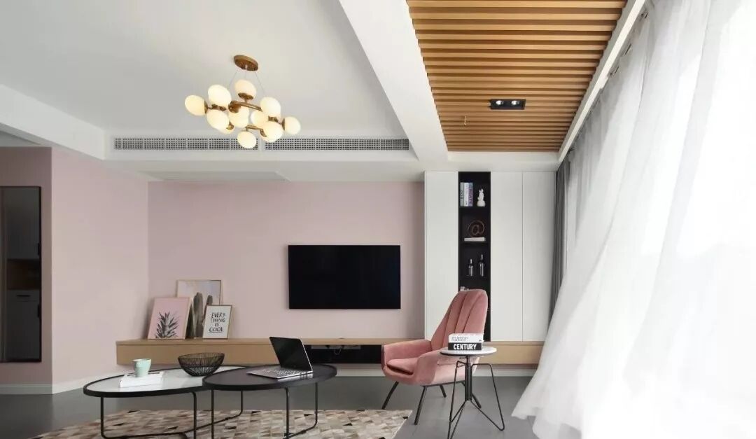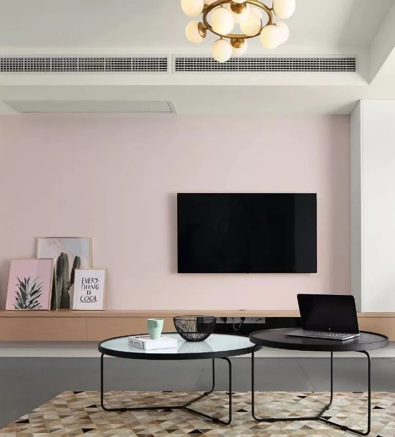 在这个以粉色为色调的空间里,从大面积的墙体背景,到单品的家具、靠枕、装饰画,都不断的呼应着,而白色的定制柜与深灰色沙发,则起到了一个很好平衡作用。