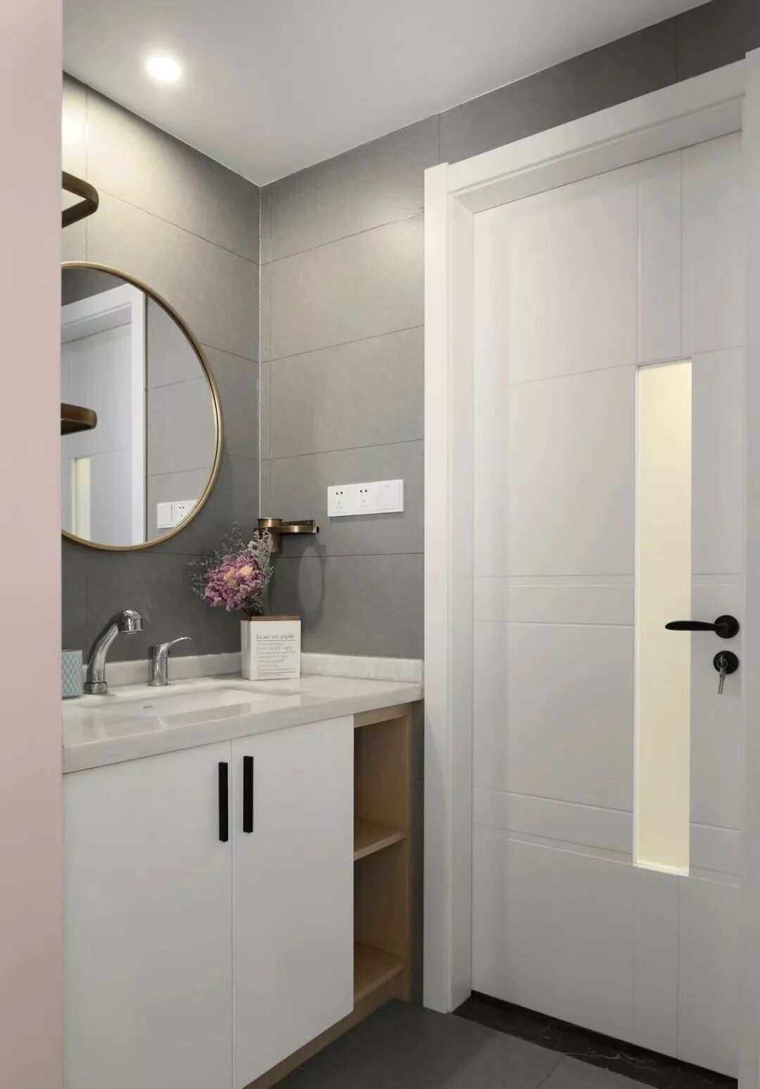 一进门,就被眼前粉给吸引了,粉色与灰色的搭配,看上去高级又很舒服。右侧是入墙玄关柜,有着收纳功能,左侧简洁的挂衣钩,用于挂包包挂衣物,出门回家都很方便。