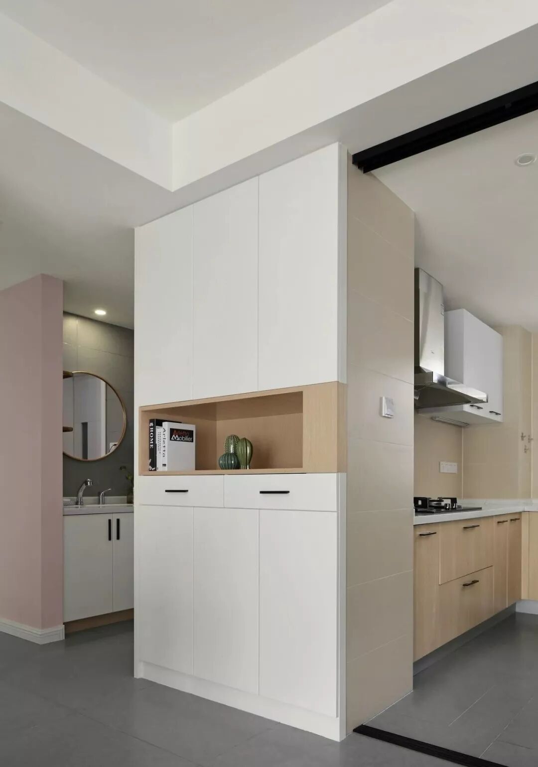 干区的墙面与地面材质、颜色统一,而柜门与房门也是统一颜色,粉色作为基调一直延续着,设计师巧妙的在沉稳与俏皮中寻求平衡,匠心独运。