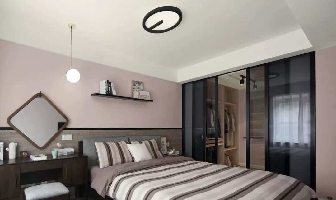 为了使主卧与衣帽间更为紧密联系并且方便出入,设计师隔墙打通设计为黑框玻璃移门,同时改变原先的进门位置。